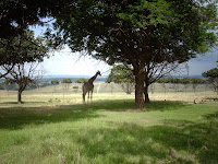 Strange observation: If you look at the line of trees closely, you'll notice that the leaves of the whole row of trees stop in a dead straight line. That line is the height of the giraffes, since they eat every leaf within their reach off the trees.