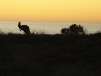 Some features: After our first stop off at the Pinnacles which was planned, we then found numerous other cool places along the way, including a lake (Lake Thetis) containing stromatolites (living 'rocks' which are the oldest form of life on earth), a beach (Kangaroo point) where we swam with pelicans flying over our heads, the Natural bridge (see pic with Ilse) which is a feature that lies close to Kalbarri, and a sunset kangaroo chase (Nic and I had to do a little bit of bundu bashing before I finally got this shot of one of the 2 kangaroos we saw hopping about). A perfect ending to a brilliant day was Darren's gourmet Christmas meal of chicken, prawns, and beef all cooked to perfection in his secret recipe marinades.