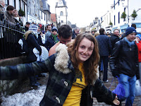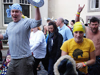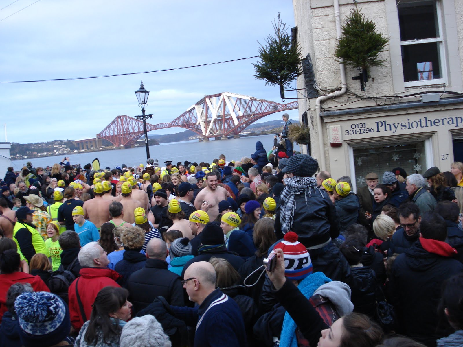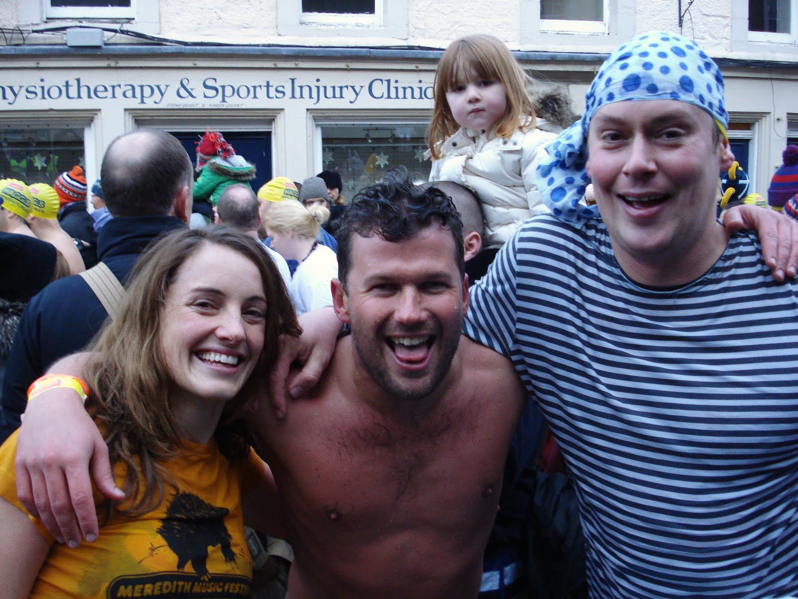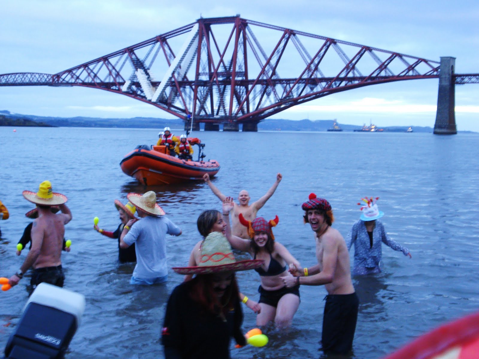 The Event: In South Queensferry on the outskirts of Edinburgh, participated in the Loony Dook which is a New Years day procession through the streets of the town ending in a plunge in the icy waters overlooked by the landmark Forth bridge. Loads of people dress up in crazy gear to take a dip. Needless to say it was freezing but we didnt anticipate how agonisingly cold our feet would get from walking on the iced cobblestones of the streets, only to be relieved by the numbness caused from taking a swim! Very fun though. (Ps That's Trev at the bottom raising his arms). By chance Liz and I are in this video on youtube - from 1:05 to 1:20 - see if you can spot us!